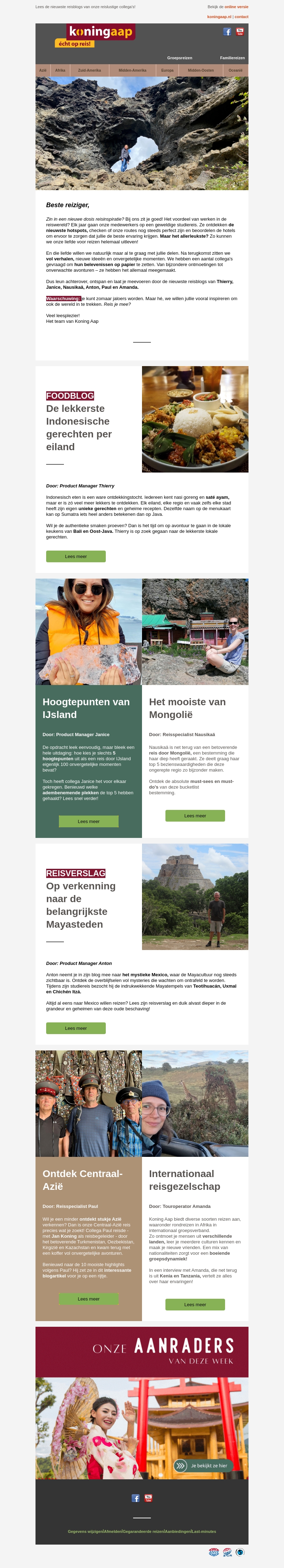 Lees de meest inspirerende reisverhalen en tips in onze nieuwste nieuwsbrief! Van de lekkerste Indonesische gerechten tot de hoogtepunten van IJsland, er is voor ieder wat wils. Ontdek ook meer over de belangrijkste Mayasteden en krijg tips voor reizen in Azië met een internationaal reisgezelschap.
