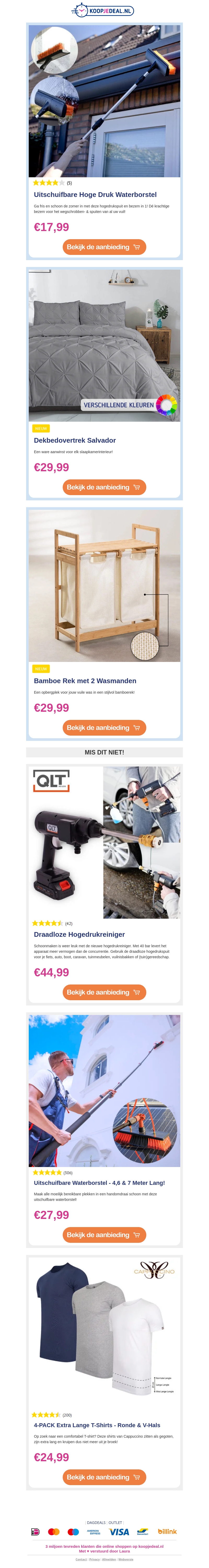 Mis deze exclusieve kortingen niet! Van handige uitschuifbare hoge druk waterborstels en stijlvolle dekbedovertrekken tot praktische bamboe rekken met wasmanden. Grijp nu je kans en bespaar flink op deze hoogwaardige items.