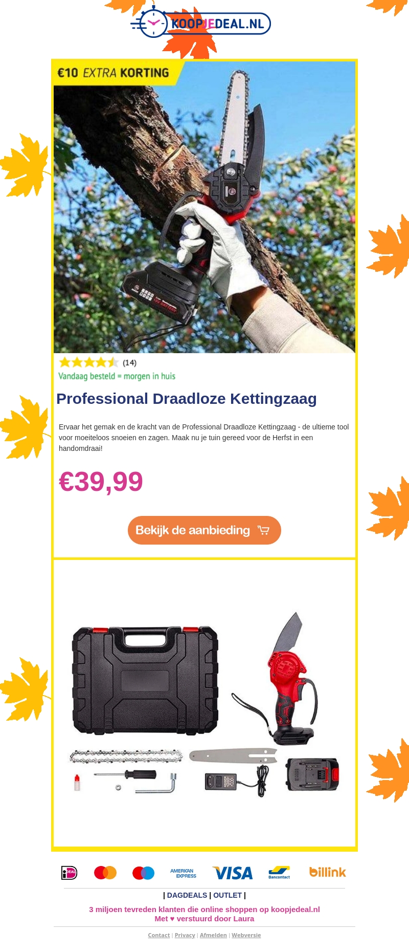 Bereid je tuin voor op de herfst met onze professionele draadloze kettingzaag. Profiteer nu van €10 extra korting. Deze zaag maakt snoeien en zagen moeiteloos. Bestel vandaag voor snelle levering. Ideaal voor al uw tuinwerk. Wacht niet langer!
