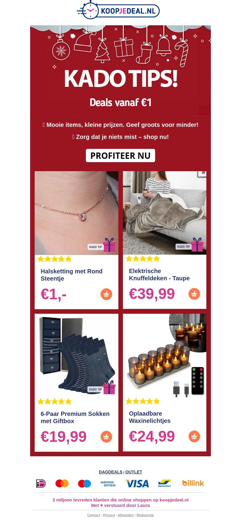 Ontdek geweldige kado tips voor de feestdagen met Koopjedeal! Van stijlvolle halskettingen en elektrische dekens tot premium sokken en oplaadbare waxinelichtjes. Shop nu en geef grootse geschenken voor minder met deals vanaf slechts €1. Mis het niet!
