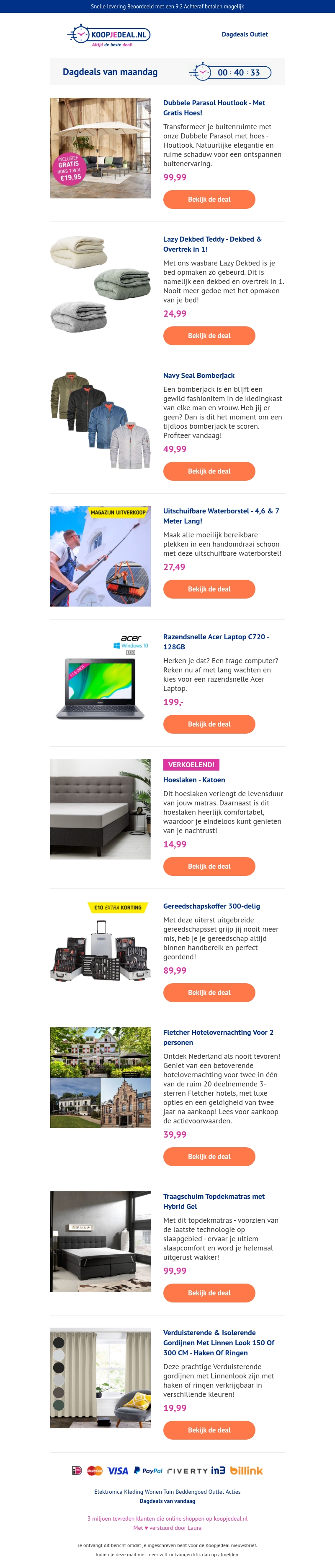 Het is je laatste kans om te profiteren van deze waanzinnige aanbiedingen! Van een dubbele parasol met gratis hoes tot een razendsnelle laptop en comfortabele dekbedden, deze deals zijn te goed om te missen. Ben op tijd en pak je voordeel voordat het te laat is!