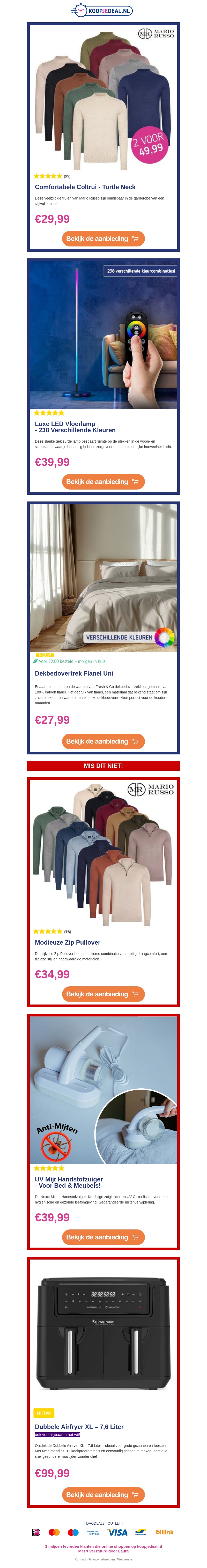 Profiteer nu van onze onweerstaanbare aanbiedingen! Vind comfortabele coltruien voor β¬49,99, een luxe LED vloerlamp voor β¬39,99 en een flanel dekbedovertrek voor β¬27,99. Mis deze kans niet om je huis te verrijken met stijlvolle en praktische producten. Bekijk snel de aanbiedingen voordat ze verdwijnen!