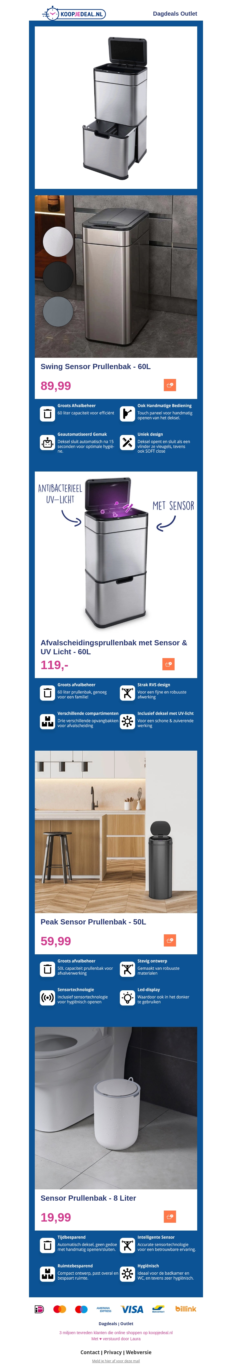 Mis deze MEGA sale op sensor prullenbakken niet! Bij Koopjedeal.nl bieden wij grote kortingen op diverse modellen. Van grote prullenbakken met 60L capaciteit tot compacte 8L versies voor uw badkamer. Ontdek onze premium functies zoals antibacterieel UV-licht, intelligente sensors, en gebruiksvriendelijke bediening. Shop nu en profiteer van deze beperkte tijdsaanbieding!