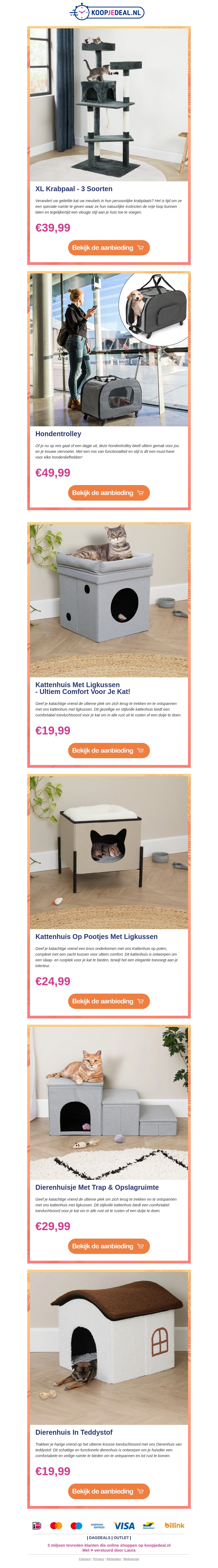 Bereid je voor op Dierendag met onze geweldige aanbiedingen voor je geliefde huisdieren. Van een XL krabpaal tot een comfortabele hondentrolley, wij hebben alles wat je nodig hebt. Shop nu en verwen je huisdier met onze top producten.