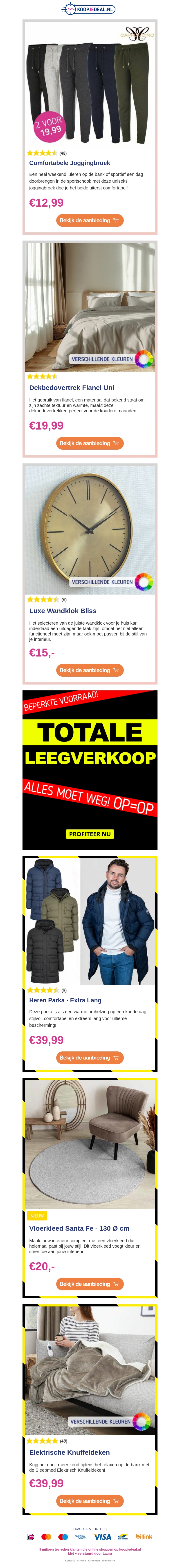 Profiteer nu van onze scherpe aanbiedingen: 2 joggingbroeken voor β¬19,99, een dekbedovertrek van flanel voor β¬19,99 en een luxe wandklok voor slechts β¬15,-. Bekijk ons volledige assortiment en mis deze kans niet om uw huis en garderobe op te frissen tegen betaalbare prijzen.