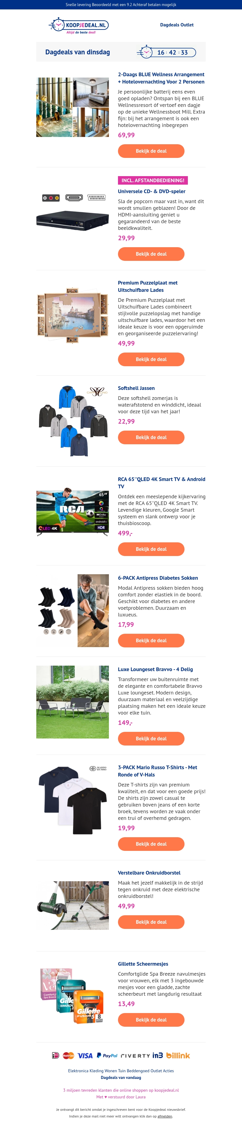 Profiteer van onze deals van dinsdag met een luxe loungeset voor slechts €149,- en waterproof softshell jassen voor €19,99. Mis de dagdeals niet, inclusief wellness arrangementen, premium puzzelplaten en meer unieke aanbiedingen.