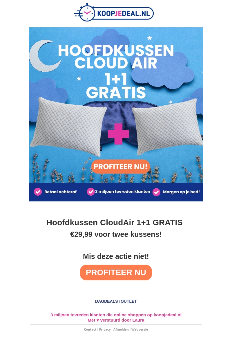 Ontdek het ultieme slaapcomfort met de Hoofdkussen CloudAir 1+1 gratis aanbieding. Voor slechts €29,99 krijg je twee exemplaren van dit aanpasbare kussen. Met miljoenen tevreden klanten en de mogelijkheid om achteraf te betalen, is dit een aanbieding die je niet wilt missen. Slapen als op een wolk was nog nooit zo voordelig!