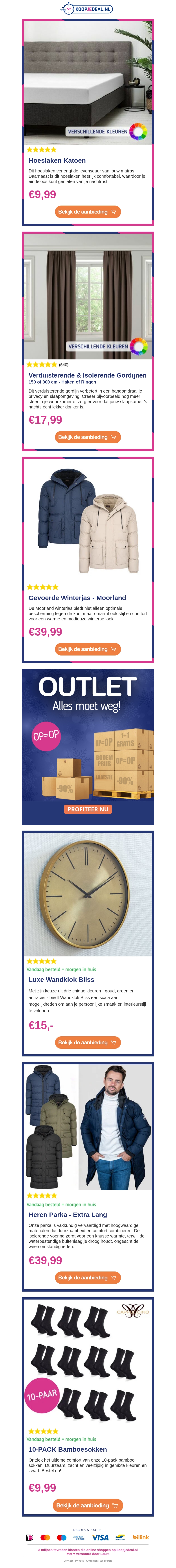 Ontvang de beste deals met ons nieuwste aanbod! Grijp je kans met katoenen hoeslakens voor slechts €9,99. Houd de warmte binnen met isolerende gordijnen voor €17,99. Bereid je voor op de winter met gevoerde winterjassen vanaf €39,99. Bekijk ook onze outlet voor meer besparingen. Mis deze topproducten niet en shop nu!