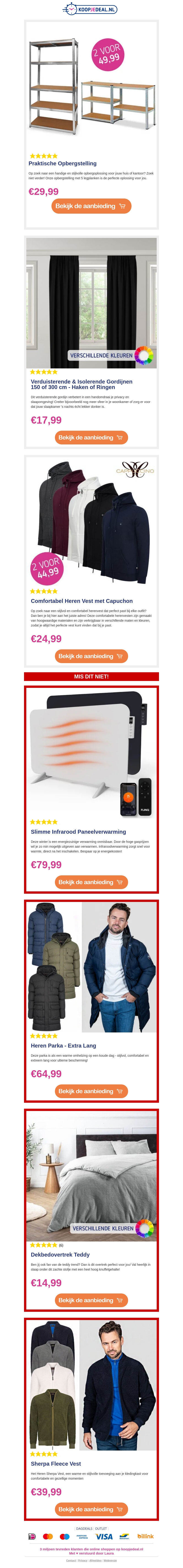 Duik in de nieuwste aanbiedingen met praktische opbergstellingen voor maar β¬29,99 en stijlvolle gordijnen vanaf β¬17,99. Mis ook de comfortabele herenvesten niet voor slechts β¬24,99. Een must-have voor iedereen die wil besparen op stijlvolle en functionele producten.