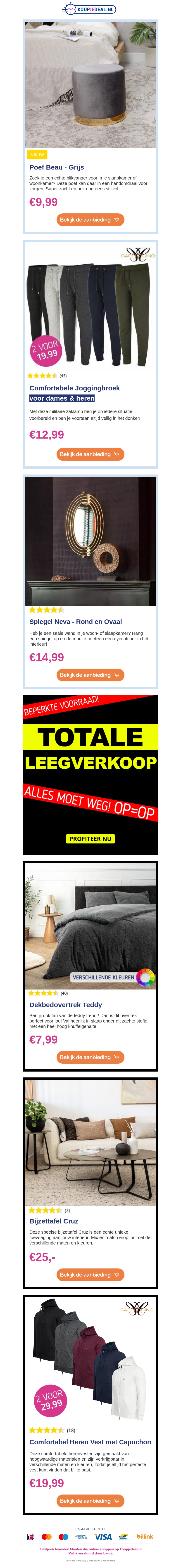 Deze nieuwsbrief biedt een selectie van ongelooflijke deals op diverse producten zoals de Poef Beau, Joggingbroek en Spiegel Neva. Alle items zijn te koop tegen sterk gereduceerde prijzen. Daarnaast is er een totale leegverkoop, waarbij alle restproducten tegen spotprijzen weg moeten. Ontdek hoogwaardige woonaccessoires en stijlvolle kleding voor een fractie van de prijs. Profiteer snel van deze aanbiedingen, want op is op! Ideaal voor slimme shoppers die van voordelige deals houden.