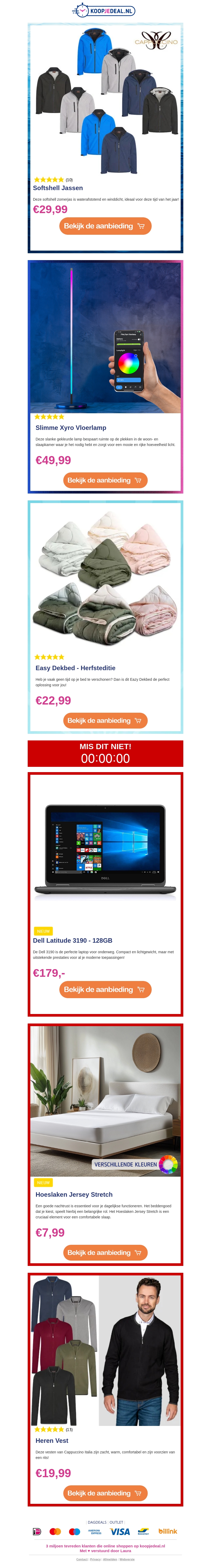 Shop nu de nieuwste aanbiedingen op indrukwekkende softshell jassen voor slechts β¬29,99. Verlicht je huis met de slimme vloerlamp voor β¬49,99 en geniet van een ontspannen nachtrust met het Easy Dekbed voor β¬22,99. Extra aanbiedingen omvatten de Dell Latitude 3190 en comfortabele jersey stretch hoeslakens.