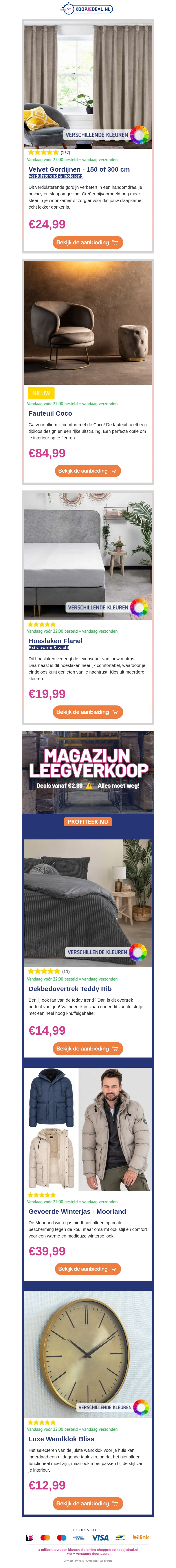 Ontvang het beste van huisdecoratie met onze Velvet Gordijnen voor slechts €24,99. Vergeet niet de Fauteuil Coco en Flanellen Hoeslaken in de aanbieding te bekijken. Wacht niet langer, maak je huis compleet tegen fantastische prijzen!