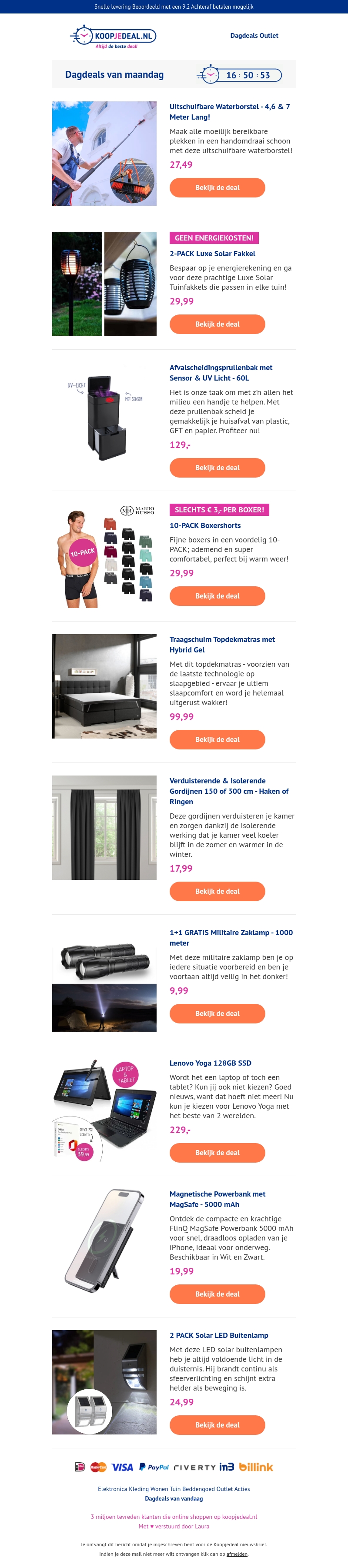 Bekijk de dagdeals van maandag op Koopjedeal.nl. Van uitschuifbare waterborstels tot luxe solar fakkels en voordelige boxershorts, wij bieden geweldige kortingen voor iedereen. Mis deze aanbiedingen niet!