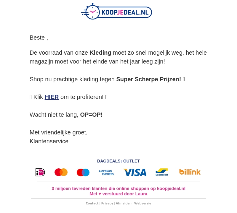 Beste, de voorraad van onze kleding moet snel weg, dus alles moet voor het einde van het jaar leeg zijn. Profiteer nu van prachtige kleding tegen super scherpe prijzen. Klik hier om te profiteren, want OP=OP! Wacht niet te lang en shop uw favoriete items bij Koopjedeal.