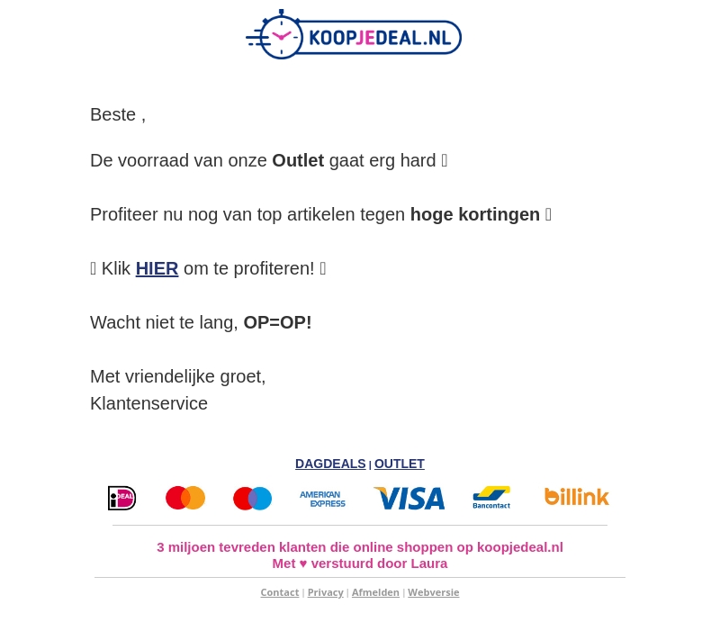 Beste, de voorraad van onze Outlet gaat erg hard. Profiteer nu van top artikelen tegen hoge kortingen. Klik hier om te profiteren. Wacht niet te lang, OP=OP! Met vriendelijke groet, Klantenservice.