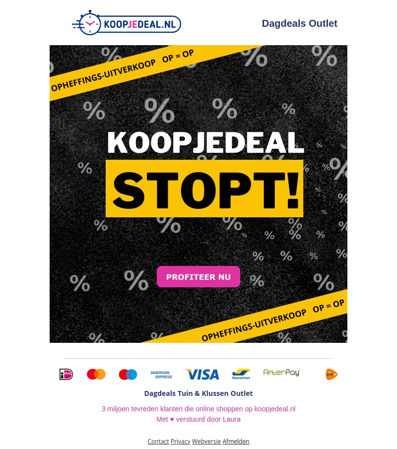 Koopjedeal.nl stopt en houdt een grote opheffingsuitverkoop. Dit is je kans om nog te profiteren van geweldige kortingen op een breed scala aan producten. OP=OP, dus wees er snel bij! Ontdek de beste deals nu en bespaar groots voordat het te laat is.