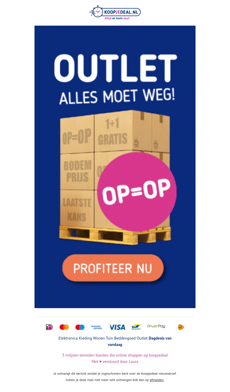 Verken de nieuwste aanbiedingen in de KoopjeDeal.nl outlet! Geniet van exclusieve kortingen, inclusief 1+1 gratis deals en bodemprijzen. Mis de laatste kans niet om geweldige deals te scoren. Op=Op!