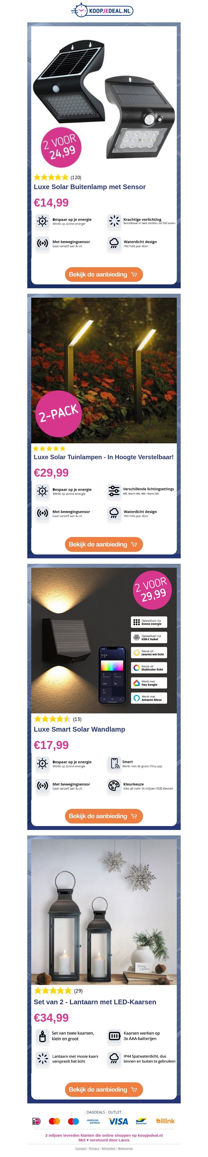 Ontdek de nieuwste aanbiedingen op luxe solar buitenlampen, verstelbare tuinlampen en stijlvolle LED-kaarsen bij KoopjeDeal. Bespaar groots op je energierekening met duurzame verlichtingsopties. Bekijk snel de aanbiedingen en mis het niet!