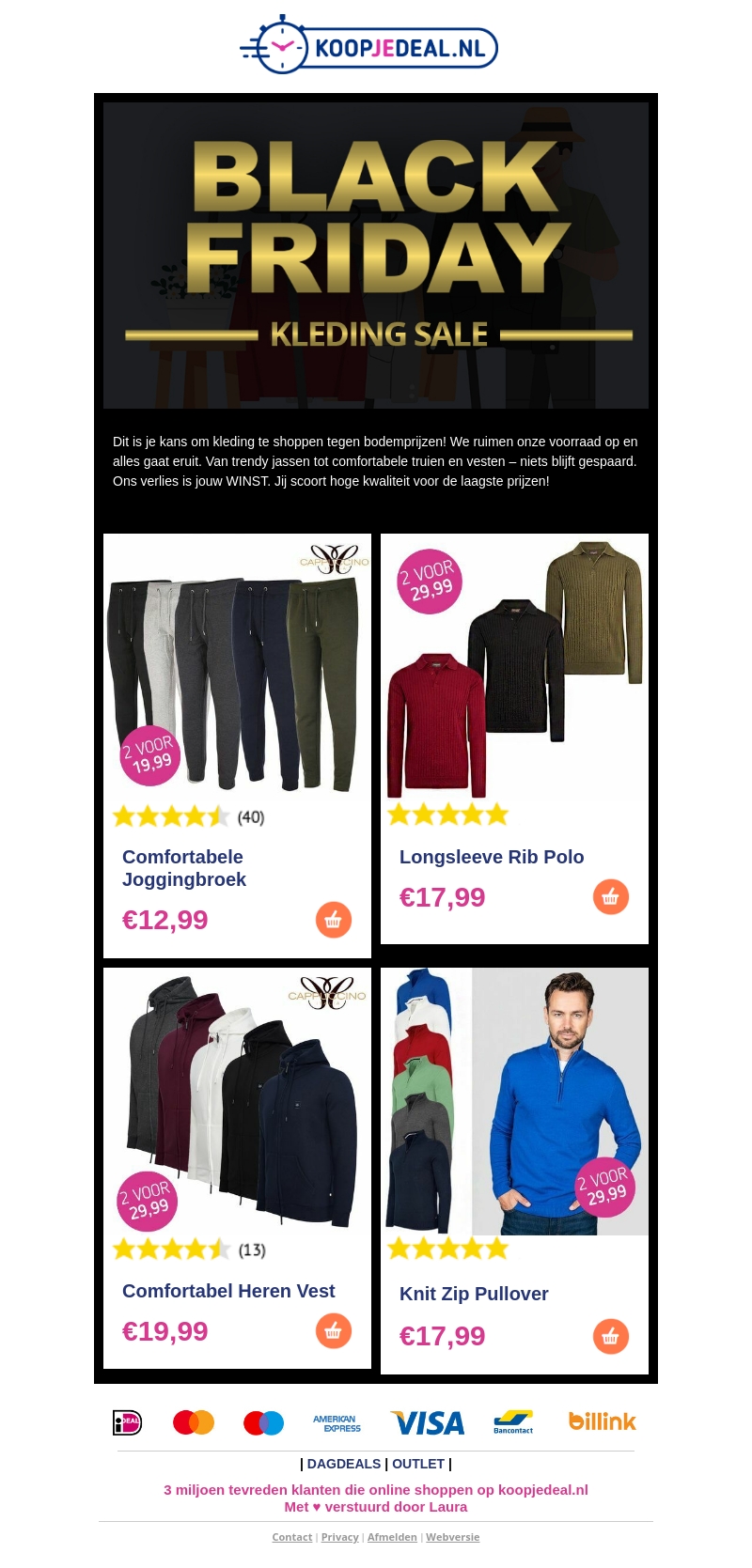 Mis de Black Friday Kleding Sale niet bij Koopjedeal. Deze week kun je trendy jassen, comfortabele truien en vesten scoren voor bodemprijzen. Alles moet weg, dus wacht niet te lang. Vind de beste aanbiedingen op kleding en shop zonder spijt. Hoogwaardige fashion voor de laagste prijzen. Jouw kans op geweldige deals is hier!