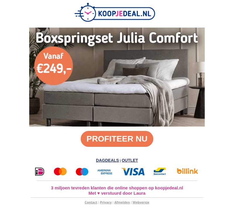 De Julia Comfort boxspringset is nu beschikbaar vanaf €249 bij Koopjedeal.nl. Deze hoogwaardige boxspring biedt zowel comfort als stijl, perfect voor elke slaapkamer. Profiteer nu van deze geweldige aanbieding. Betaal gemakkelijk met Visa, Mastercard en meer. Bestel vandaag nog online. Meer dan 3 miljoen tevreden klanten gingen je voor.