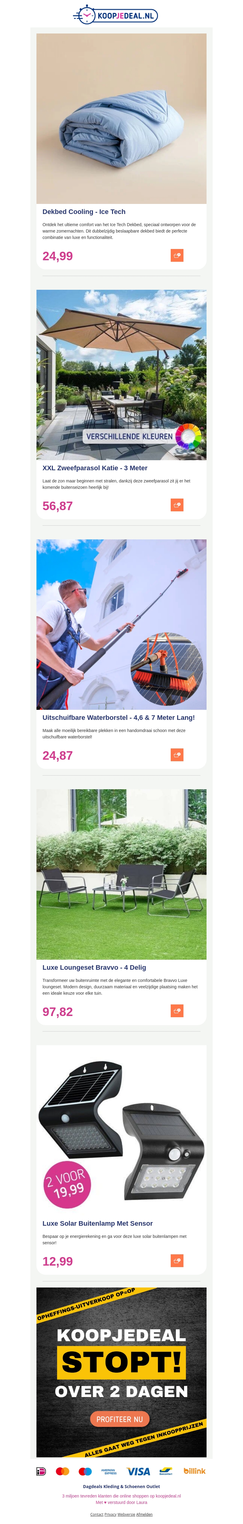 Bekijk onze nieuwste zomer aanbiedingen! Geniet van ultieme comfort met het Cooling Dekbed. Bescherm uzelf tegen de zon met de XXL Zweefparasol Katie. Verlicht uw tuin efficient met de Luxe Solar Buitenlamp Met Sensor, nu 2 voor €19,99.