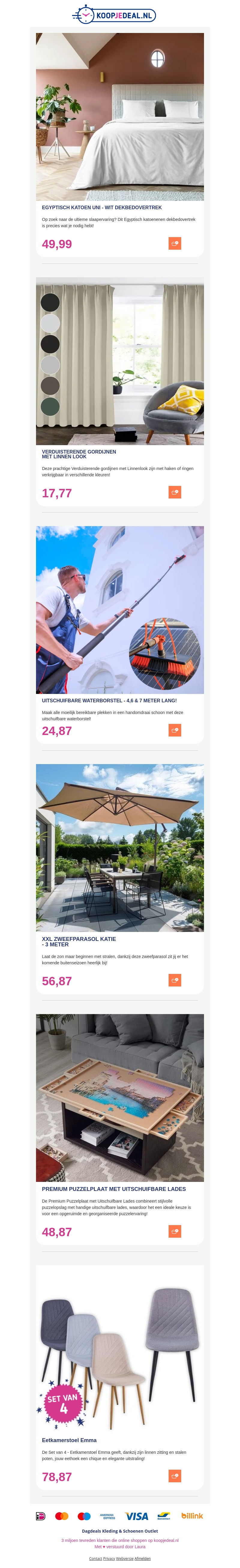 Mis deze geweldige aanbiedingen niet! Of je nu op zoek bent naar comfortabel beddengoed, stijlvolle gordijnen, of een eenvoudig schoonmaaksysteem, we hebben het allemaal. Bekijk onze nieuwste deals en bespaar op jouw favoriete producten.