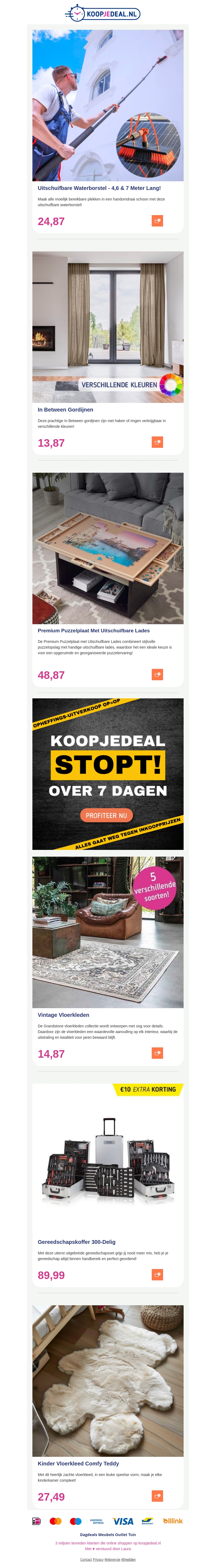 Koopjedeal.nl biedt de goedkoopste uitschuifbare waterborstels van Nederland. Maak snel en eenvoudig je buitenruimtes schoon met deze waterborstel die uitschuifbaar is tot 4,8 of 7 meter. Mis ook de kortingen op andere geweldige producten zoals gordijnen, puzzelplaten, vloerkleden en meer.