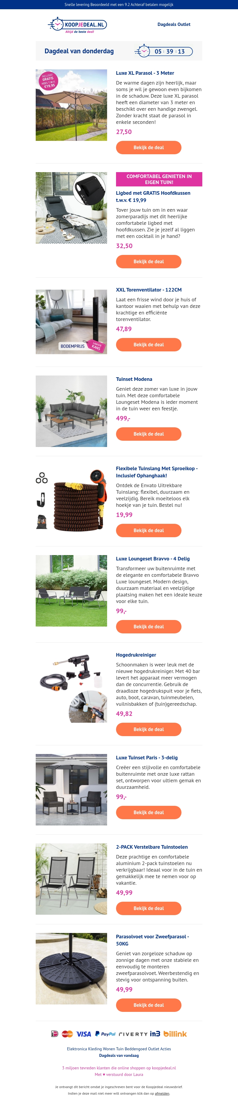 De leegverkoop is begonnen bij Koopjedeal.nl! Profiteer van geweldige kortingen op diverse producten, zoals luxe tuinmeubelen, ventilatoren, parasols en nog veel meer. Wees er snel bij, want op=op!
