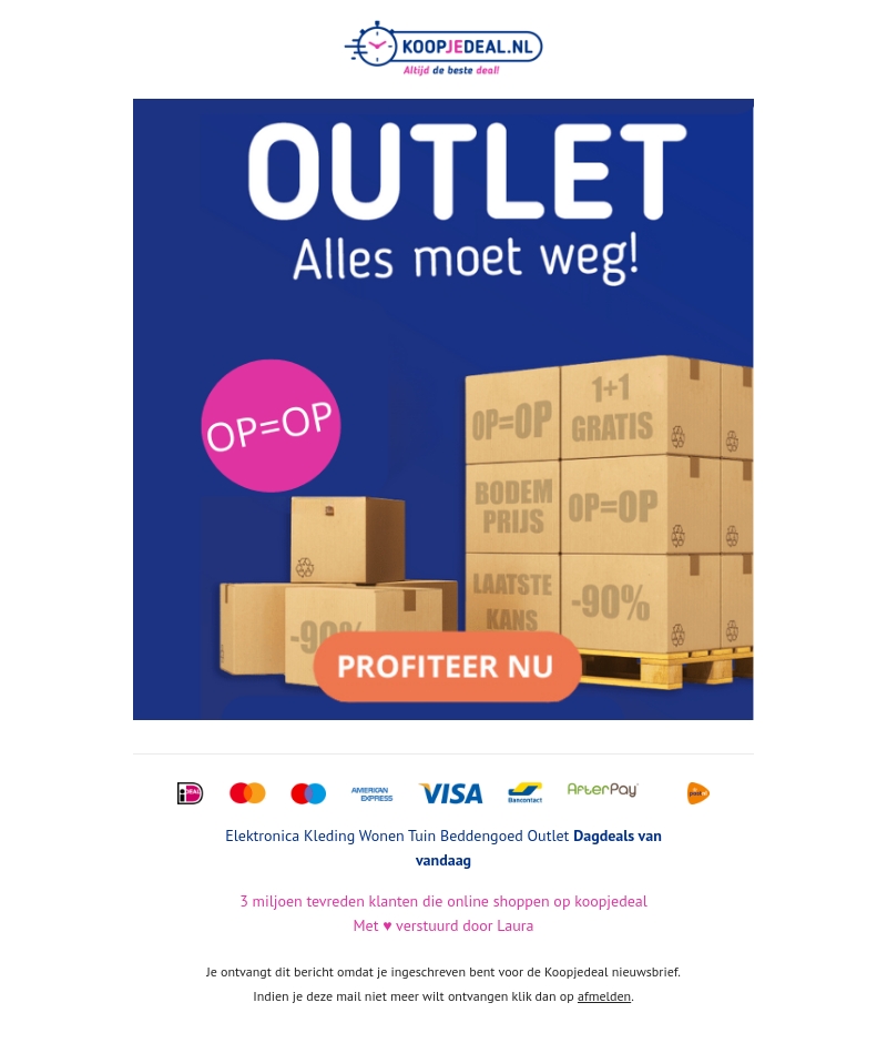 De Koopededeal Outlet is aangevuld! Shop nu en profiteer van ongekende kortingen op elektronica, kleding, wonen, tuin, beddengoed en meer. Wacht niet te lang, want op=op! Mis deze kans niet en shop vandaag nog bij Koopjedeal.