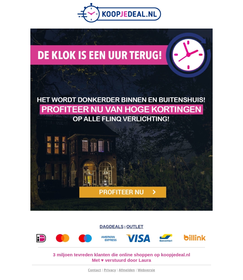 De wintertijd is aangebroken en het wordt steeds donkerder. Koopjedeal biedt nu hoge kortingen op alle FlinQ verlichting. Profiteer van deze geweldige deals om je huis zowel binnen als buiten te verlichten. Mis deze kans niet om te besparen en tegelijkertijd je huis een warme en gezellige sfeer te geven.