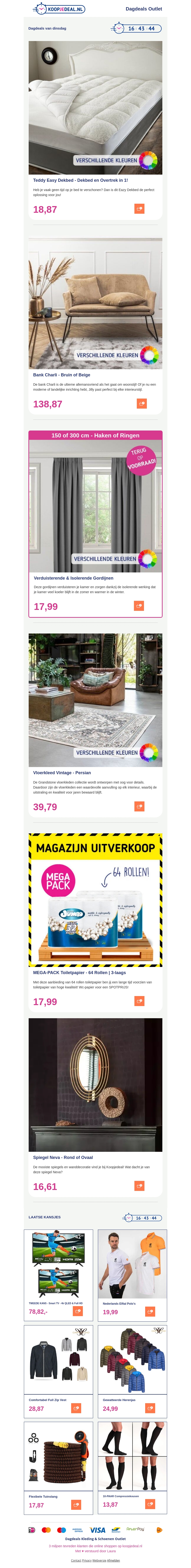 Ontdek onze nieuwste aanbiedingen op praktische en stijlvolle producten, waaronder het Teddy Easy Dekbed voor €18,87, de Bank Charli voor €138,87, en isolerende gordijnen voor slechts €17,99. Haast je en profiteer van deze geweldige deals voordat ze weg zijn!