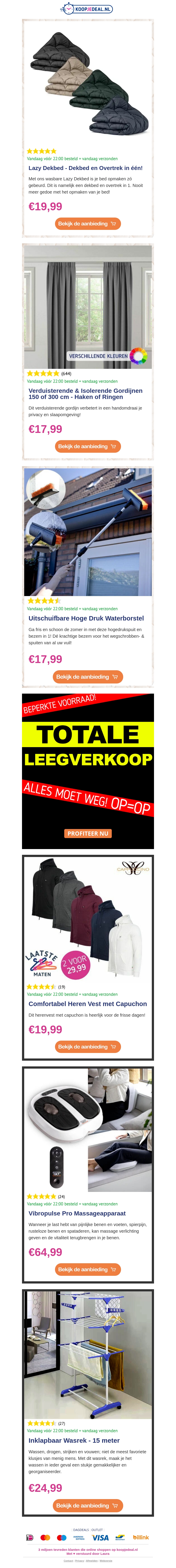 Ontdek de nieuwste deals op een Lazy Dekbed & Overtrek in één voor slechts β¬19,99. Profiteer van isolerende gordijnen vanaf β¬17,99 om warmte te behouden. Ervaar ultieme reiniging met de Hoge Druk Waterborstel voor β¬17,99. Mis onze totale leegverkoop niet en verwen uzelf met comfortartikelen zoals het VibroPulse Pro Massageapparaat.