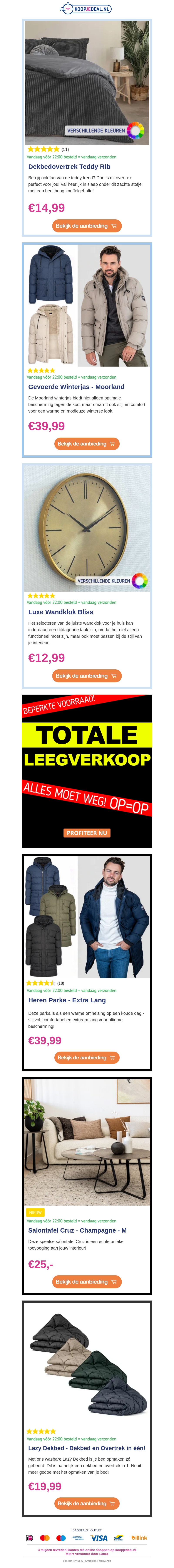 Kijk snel voor de beste winterdeals! Prachtige dekbedovertrekken voor slechts β¬14,99, warme winterjassen vanaf β¬39,99 en luxe wandklokken voor β¬12,99. Perfecte items om je huis en garderobe op te frissen.