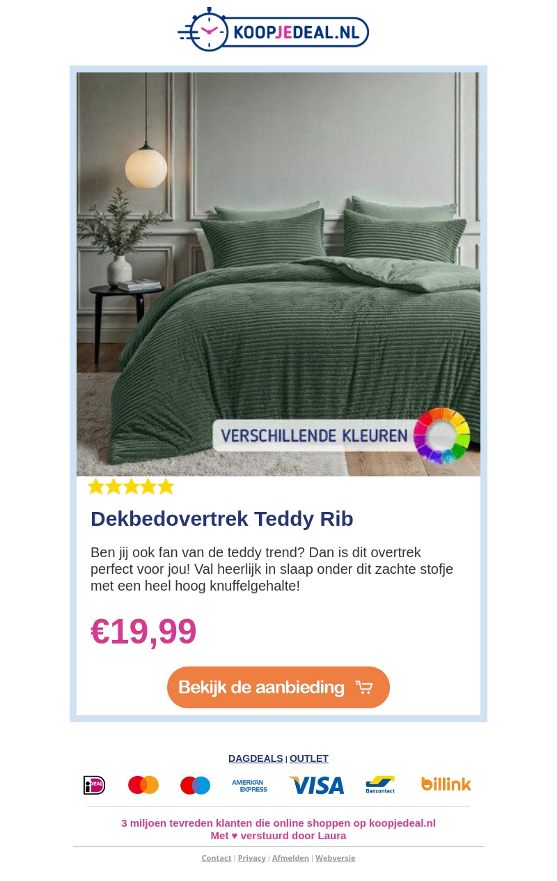 Ontdek het ultieme knuffelcomfort met het Dekbedovertrek Teddy Rib, ideaal voor liefhebbers van de teddytrend. Het zachte ribmateriaal zorgt voor een warme en knusse sfeer, perfect om in weg te dromen. Beschikbaar in verschillende kleuren om aan jouw interieur aan te passen. Profiteer van de aantrekkelijke prijs van €19,99 en geef je slaapkamer een stijlvolle en comfortabele upgrade. Ideaal voor koude winteravonden of gewoon om jezelf te verwennen. Snel en veiliger bestellen via Koopjedeal.nl.