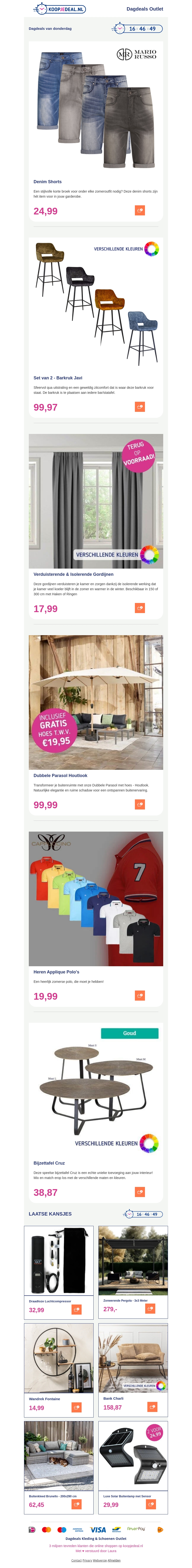 Bekijk de beste koopjes van deze week! Denim Shorts voor slechts €24,99, trendy barkrukken set voor €99,97, en stijlvolle gordijnen voor €17,99. Mis het niet!