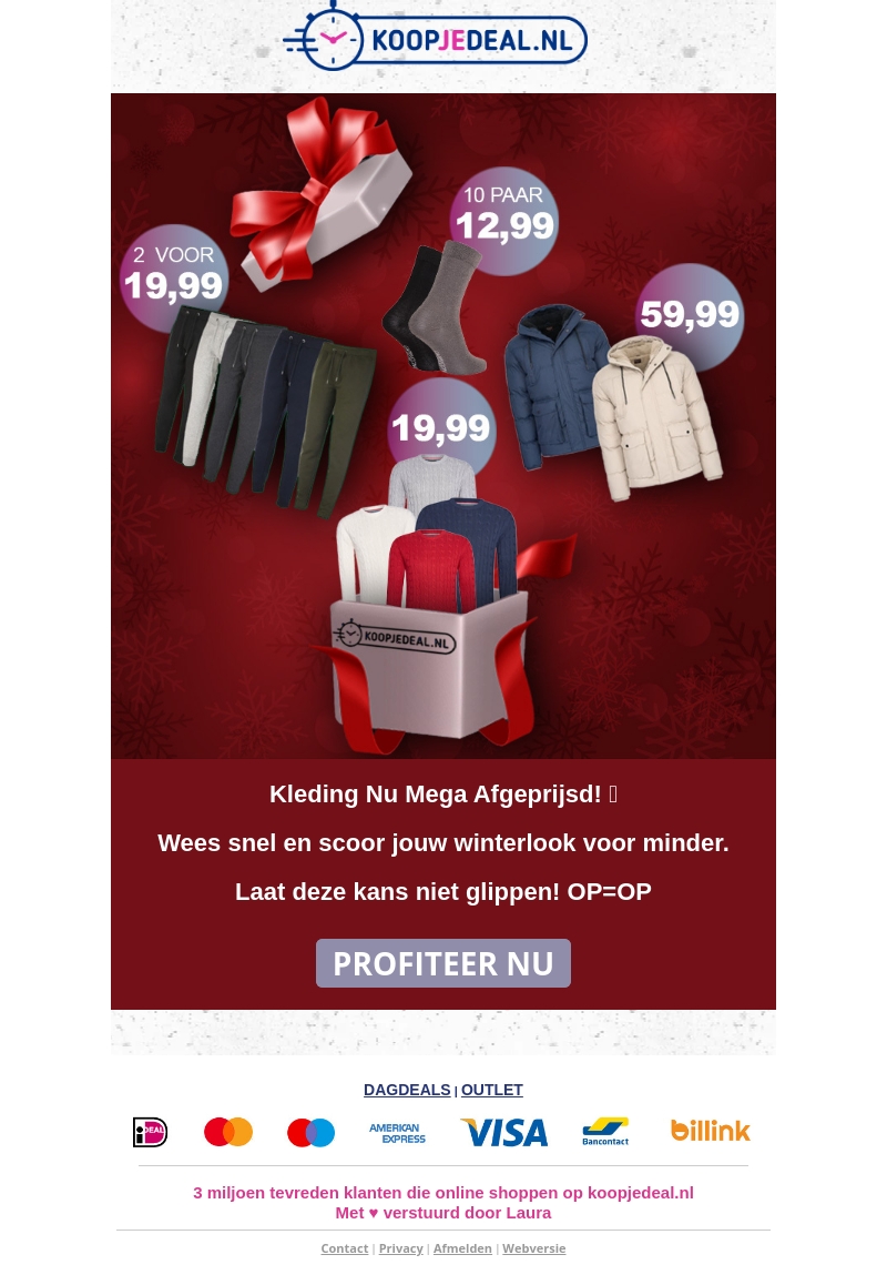 Koopjedeal.nl biedt geweldige kortingen op winterkleding. Mis deze kans niet om jouw winterlook te scoren. Er zijn sokken, truien en jassen voor vierkante prijzen. Wees er snel bij, want op=op! Profiteer nu van de beste deals.