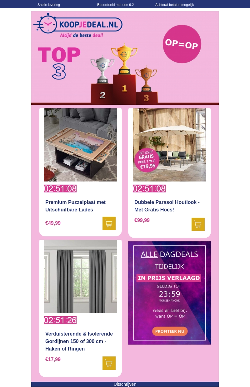Koopjedeal.nl presenteert de top 3 producten van vandaag! Bekijk nu de exclusieve premium puzzelplaat, de dubbele parasol inclusief gratis hoes, en de verduisterende en isolerende gordijnen. Mis deze kans niet en profiteer van fantastische kortingen!