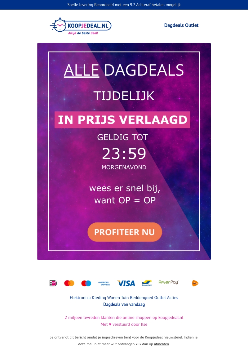 Ontvang exclusieve kortingen op alle dagdeals bij Koopjedeal. Tijdelijk zijn de prijzen verlaagd tot 23:59 morgenavond. Wees er snel bij, want op = op. Mis deze kans niet en profiteer nu van geweldige aanbiedingen.