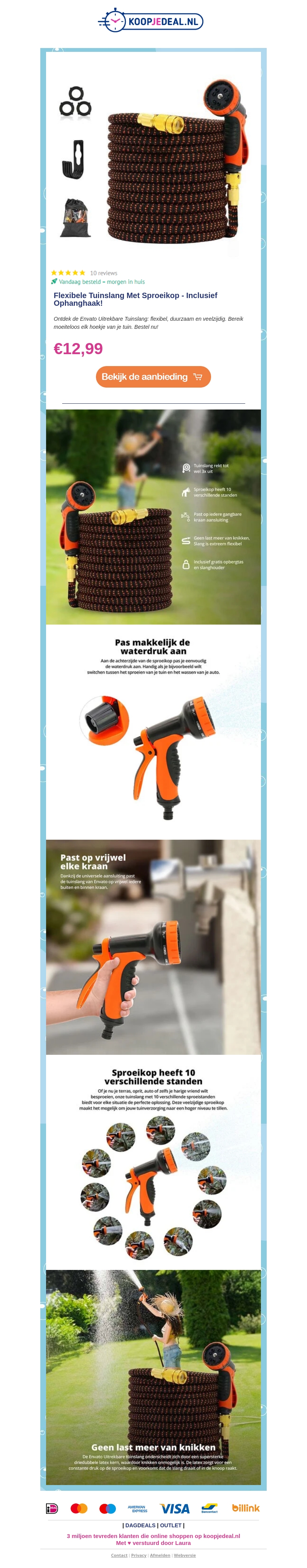 Ontvang de goedkoopste flexibele tuinslang van Nederland voor slechts €12,99. Inclusief sproeikop en ophanghaak. Deze duurzame en veelzijdige tuinslang past op bijna elke kraan en biedt 10 instelbare standen voor elke behoefte. Perfect voor elke tuin, bestel nu!
