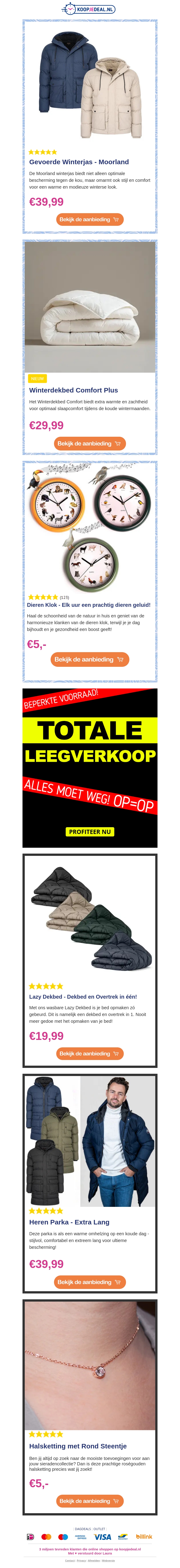 Verwarm je garderobe deze winter met een betaalbare gevoerde winterjas voor slechts €39,99. Vind daarnaast een comfortabel winterdekbed voor €29,99. Voor de liefhebbers van unieke decoraties is er een dierenthema klok voor maar €5. Mis ook de totale leegverkoop niet met unieke kortingen op diverse items.