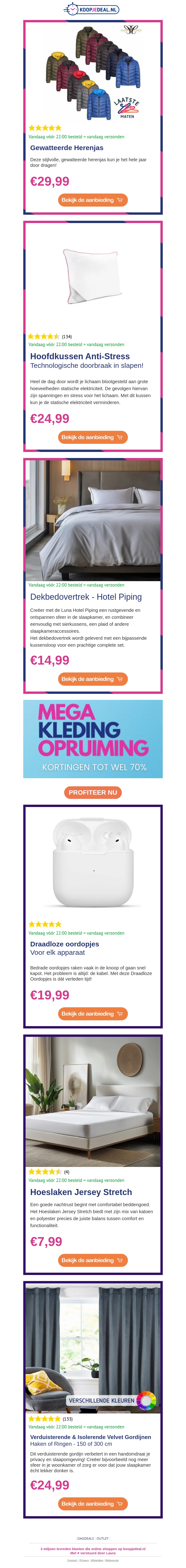 Ontdek de nieuwste aanbiedingen waaronder een gewatteerde herenjas voor slechts €29,99. Profiteer van ontspannende anti-stress hoofdkussens en luxe hotel stijl dekbedovertrekken voor een fantastische prijs. Bekijk ook de mega kledingopruiming met hoge kortingen.