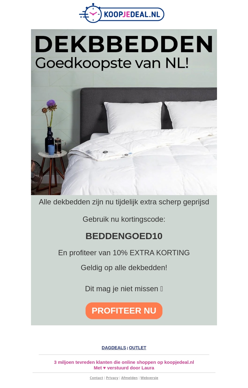 Koopjedeal.nl biedt nu tijdelijk de goedkoopste dekbedden van Nederland aan. Geniet van extra scherpe prijzen op alle dekbedden. Gebruik de kortingscode BEDDENGOED10 voor 10% extra korting. Deze aanbieding is tijdelijk geldig en toegankelijk voor iedereen. Mis deze kans niet om je slaapkamer op te frissen voor minder geld. Profiteer vandaag nog!