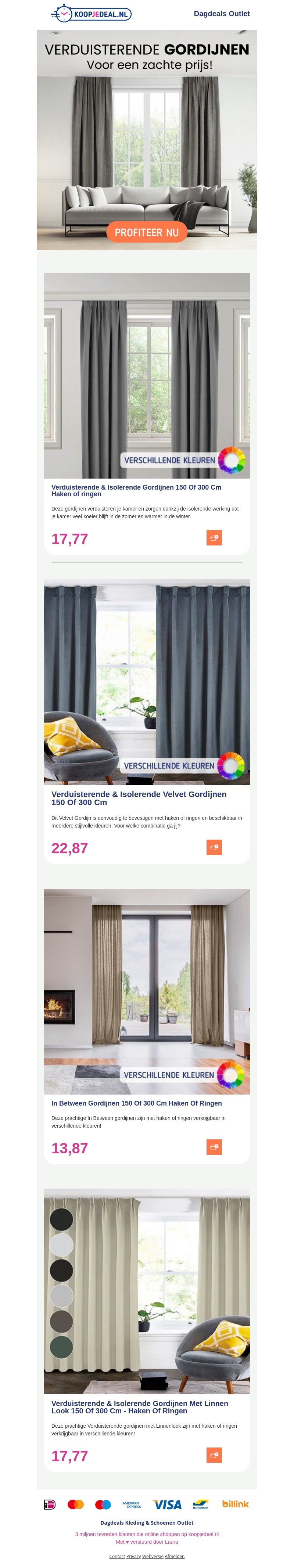 Profiteer van onze speciale aanbieding op verduisterende gordijnen! Bekijk onze collectie die beschikbaar is in verschillende kleuren en stijlen. Houd je huis koel in de zomer en warm in de winter met onze isolerende gordijnen.