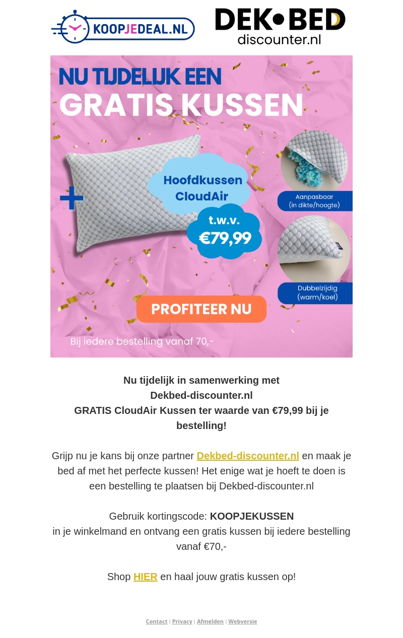 Ontvang nu tijdelijk een gratis CloudAir kussen ter waarde van €79,99 bij Dekbed-discounter. Plaats een bestelling van minimaal €70 en gebruik de kortingscode KOOPJEKUSSEN. Het kussen is aanpasbaar en dubbelzijdig voor optimaal comfort.