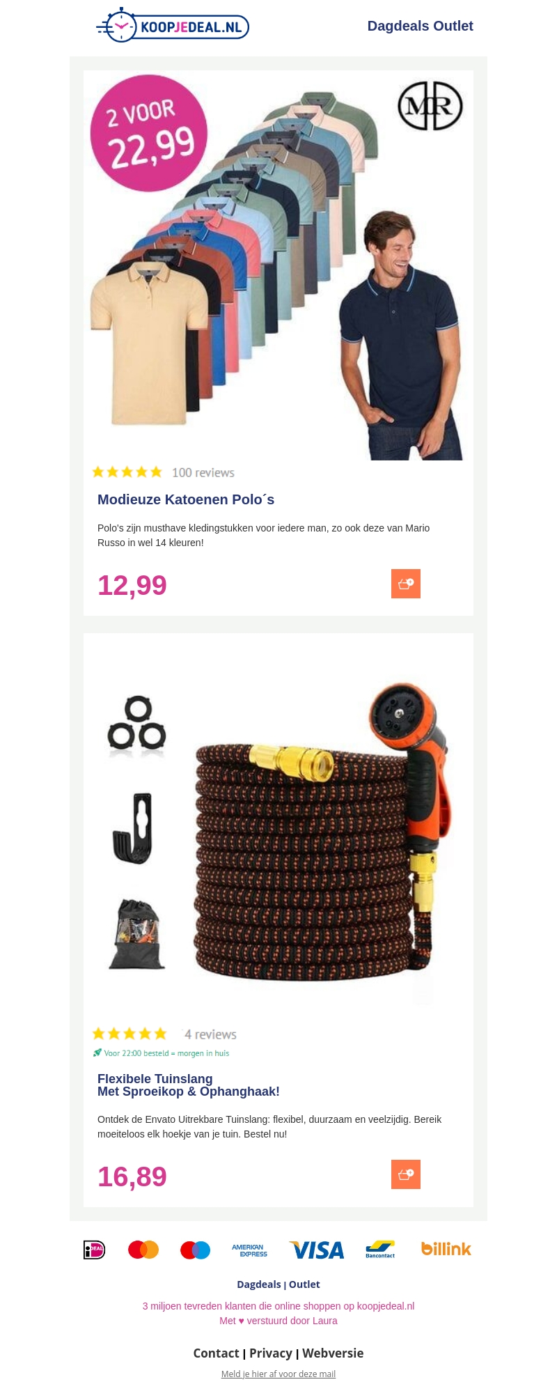 Profiteer van de spectaculaire aanbiedingen van vandaag! Ontvang modieuze katoenen polo's voor slechts 12,99 en een flexibele tuinslang met sproeikop voor 16,89. Mis deze kans niet om topkwaliteit producten tegen een scherpe prijs te kopen. Bestel nu snel!