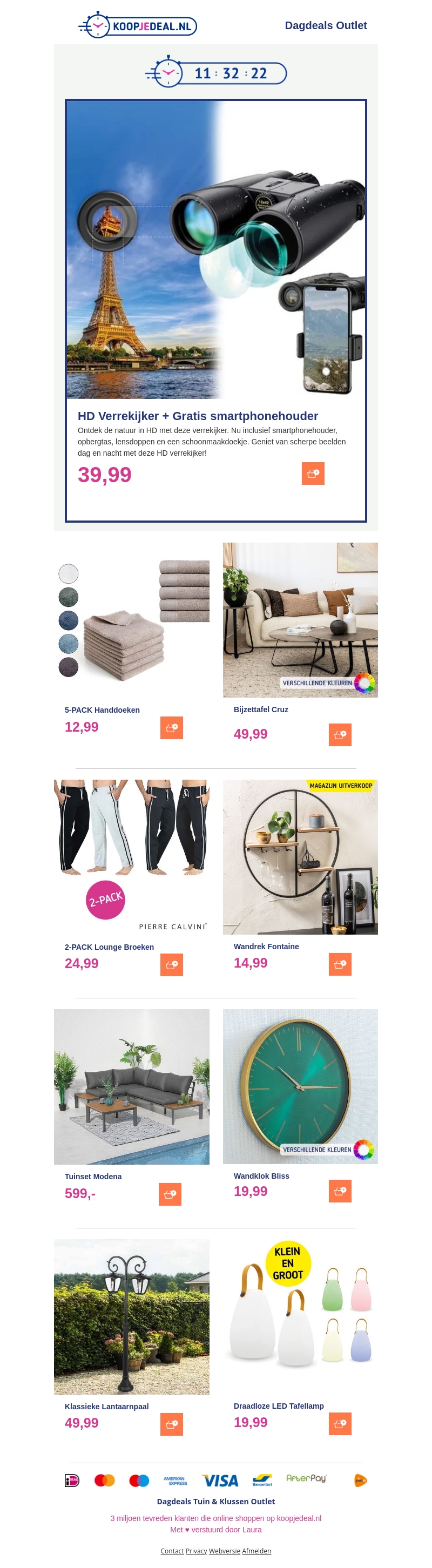 Grijp deze geweldige aanbiedingen: HD Verrekijker voor β¬39,99, 5-Pack Handdoeken voor slechts β¬12,99, en de stijlvolle Bijzettafel Cruz voor β¬49,99. Verken de natuur met scherpe beelden, verfris je badkamer en upgrade je woonkamer met deze deals. Beleef het nu, mis het niet!