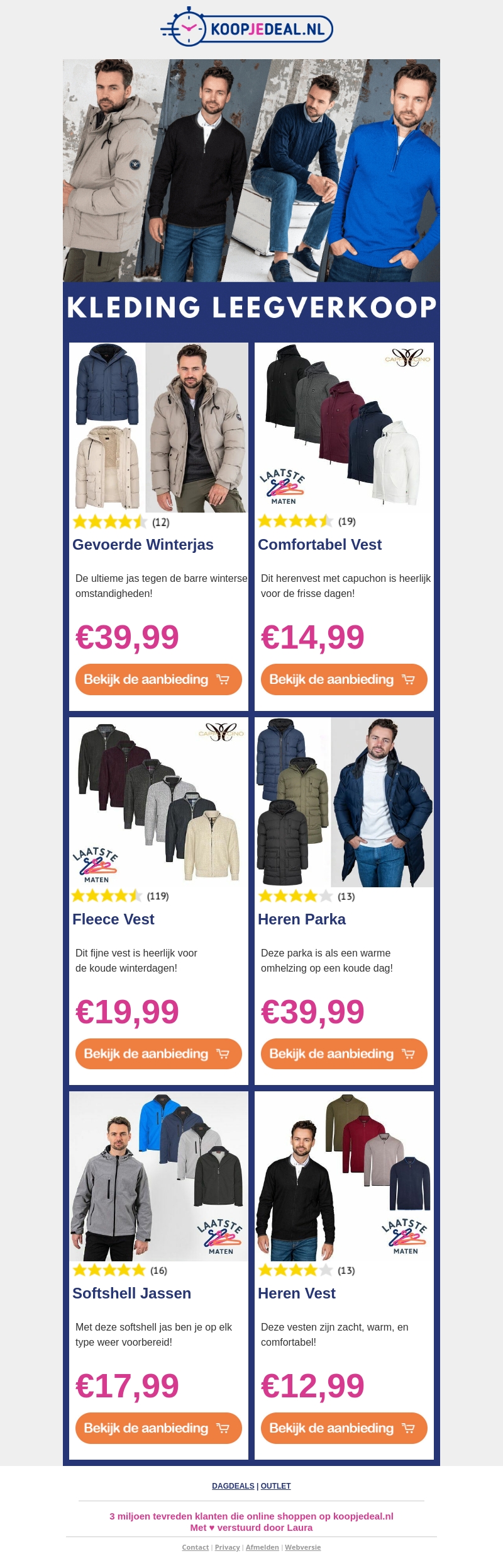 Grijp nu je kans op enorme kortingen tot wel 90% op herenkleding bij Koopjedeal.nl. Ontdek gevoerde winterjassen, comfortabele vesten en meer. Voorzien van de beste kwaliteit en lage prijzen. Mis deze uitverkoop niet en koop jouw favoriete stukken. Snelle levering en uitstekende klantbeoordelingen!
