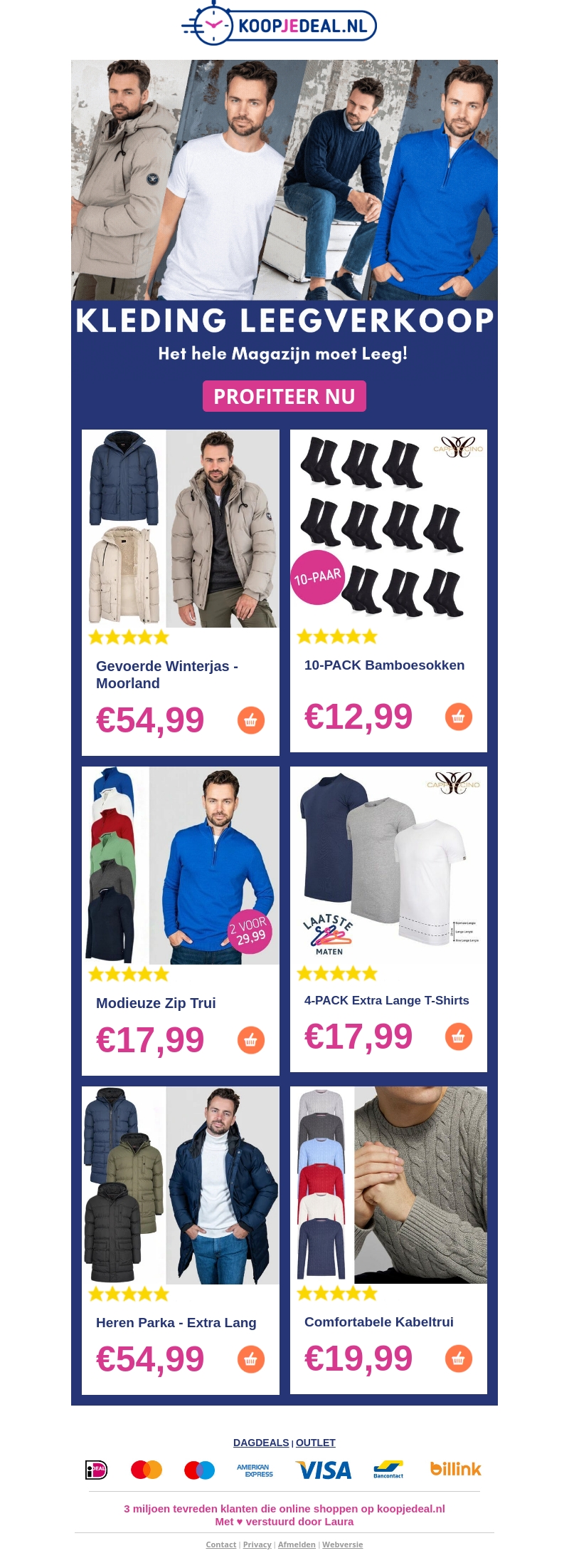 Geniet van ongelooflijke kortingen tijdens de kleding leegverkoop. Van gevoerde winterjassen tot comfortabele kabeltruien, koopjeaanbiedingen bij Koopjedeal.nl. Mis deze uitverkoop niet en vernieuw je garderobe voor minder!