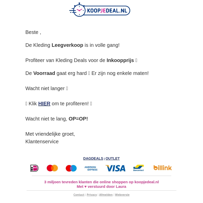 Profiteer nu van de exclusieve kleding leegverkoop bij koopjedeal.nl. Ontvang kleding voor de inkoopprijs en wees er snel bij, want de voorraad raakt snel op. Klik op de link om direct te profiteren van deze geweldige aanbiedingen. Wacht niet te lang, want OP=OP!
