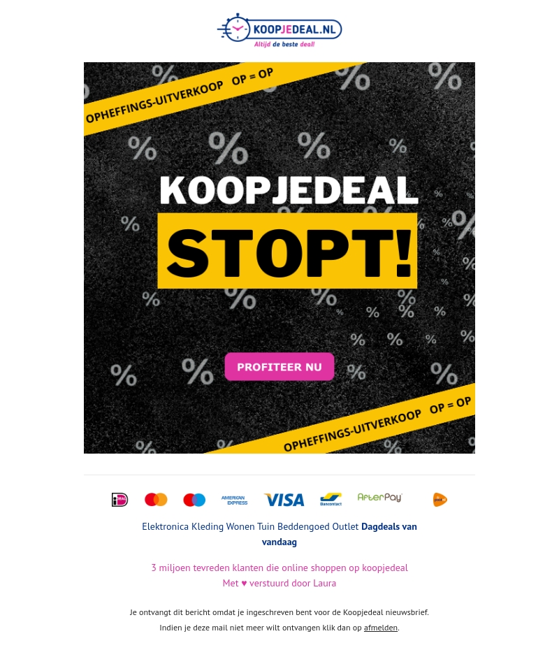 Koopjedeal stopt met haar activiteiten. Dit is je laatste kans om te profiteren van geweldige aanbiedingen en kortingen. Bezoek onze website en ontdek de beste deals op elektronica, kleding, tuinartikelen en meer. Wacht niet te lang, want op is op!